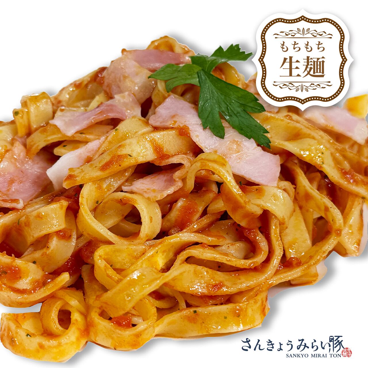 厳選されたトマトソースは、フレッシュなトマトの風味とベーコンの旨みが見事に調和しています。生麺はもちもちとした食感で、ソースが絡まり、一口ごとに豊かな味わいが広がります。